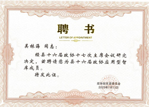 我所主任會計師吳林海同志被政協(xié)如東縣委員會2023713聘為縣十六屆政協(xié)應用型智庫成員。