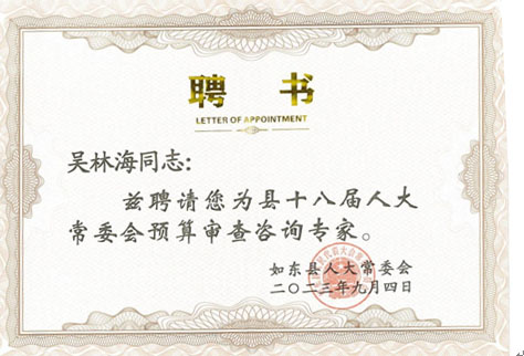 被聘為如東縣人大常委會202394聘為縣十八屆人大常委會預算審查咨詢專家。